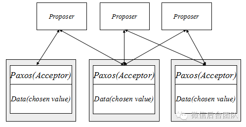 上文提到一个三个Acceptor和Proposer各自遵守paxos协议,协同工作最终完成一个值的确定。这里先定义一个概念,Proposer,各个Acceptor,所服务的Data共同构成了一个大的集合,这个集合所运行的paxos算法最终目标是确定一个值,我们这里称这个集合为一个paxos instance,即一个paxos实例。