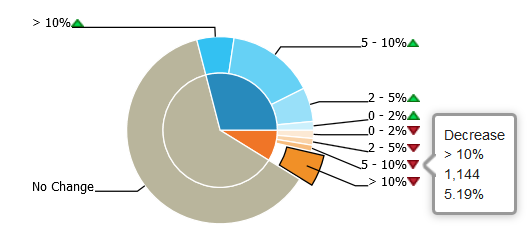 import java.util.List; import org.openqa.selenium.WebElement; import org.openqa.selenium.By; import org.openqa.selenium.WebDriver; public class DonutChart { public static WebDriver driver; public static final String noChange = "No Change"; public static final String increase = "Increase"; public static final String decrease = "Decrease"; public static final String percentage0To2 = "0 - 2%"; public static final String percentage2To5 = "2 - 5%"; public static final String percentage5To10 = "5 - 10%"; public static final String percentage10 = "> 10%"; public static final String noChangeColor = "rgb(185, 181, 156)"; public static final String increaseColor = "rgb(40, 138, 188)"; public static final String decreaseColor = "rgb(240, 117, 39)"; public static final String increase0To2Color = "rgb(204, 240, 252)"; public static final String increase2To5Color = "rgb(153, 224, 249)"; public static final String increase5To10Color = "rgb(102, 209, 245)"; public static final String increase10Color = "rgb(51, 193, 242)"; public static final String decrease0To2Color = "rgb(252, 233, 212)"; public static final String decrease2To5Color = "rgb(249, 211, 169)"; public static final String decrease5To10Color = "rgb(247, 188, 125)"; public static final String decrease10Color = "rgb(241, 144, 39)"; public static final String outerRingLocator = "//div[@id='emx_eChart_eChart_0']/ div[@class='emxChartWrapper']/*[name()='svg']/*[name()='g'][1]"; public static final String innerRingLocator = "//div[@id='emx_eChart_eChart_0']/ div[@class='emxChartWrapper']/*[name()='svg']/*[name()='g'][2]"; public WebElement findSliceByColor(String ringLocator, String sliceColor) { String firstChildLocator = ringLocator + "/*[1]"; WebElement firstChild = driver.findElement(By.xpath(firstChildLocator)); //首先判断当前的饼状图是有多个切片还是只有一个切片的圆 if (firstChild.getTagName().equalsIgnoreCase("circle")) { //如果第一个切片的标签名字是 circle,说明这是个圆,圆只有一个切片 if (sliceColor.equalsIgnoreCase(firstChild.getAttribute("fill"))) { return firstChild; } else { return null; } //如果第一个切片的标签名字不是 cricle,说明将有多个切片存在 } else { List<WebElement> children = driver.findElement(By.xpath(ringLocator + "/*[starts-with(@fill,'rgb')]")); //遍历所有切片的属性,找到目标切片,并返回 for (int i = 1; i <= children.size(); i++) { WebElement currentChild = driver.findElement(By.xpath(ringLocator + "/*[starts-with(@fill,'rgb')]" + "[" + i + "]")); String currentColor = currentChild.getAttribute("fill"); if (sliceColor.equalsIgnoreCase(currentColor)) { return currentChild; } } } return null; } }我们再看看图 3 中的柱状图并结合它在 HTML 中的结构,发现以下几个特征: