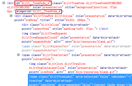 Dojo 结构复杂,在对生成的 DOM 树中的元素属性进行赋值时,按照该属性在 DOM 树中的位置,自动的赋予了该元素一个数字,如下图 1 所示,该树节点元素的 ID 属性为 id=”dijit_TreeNode_4”,由 Dojo 自动生成,由一个特定字符串前缀与一个动态的数字组成,数字“4”表示这个数节点位于整个 DOM 数的第 4 个位置。