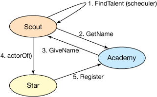 清单 1 中的应用程序非常简单,我只是简要地解释了一下 actor 交互。这个复杂得多的新应用程序需要一种更好的方式来表示这些交互。消息传递图是显示这些交互的一种好方式。图 1 显示了一个 Scout 寻找一位新 Star(或用 actor 的术语来讲,创建一个 Star)和新 Star 向 Academy 注册所涉及的交互顺序。