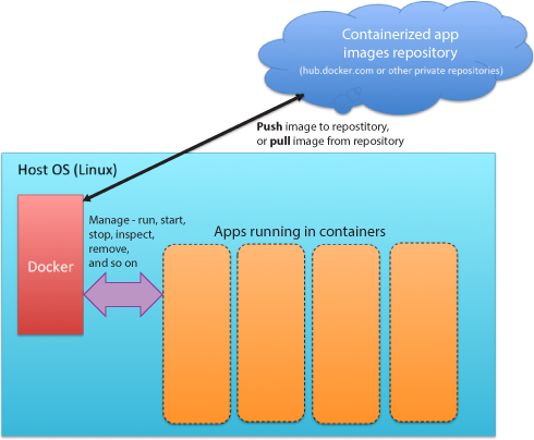 Docker 是一个容器管理器。容器将应用程序和它的依赖项捆绑在一起。您从一个存储在存储库中的镜像实例化每个容器,在主机操作系统内隔离的虚拟化环境中运行容器。因为虚拟化技术(通常)是轻量型的,所以您可以同时运行多个容器: