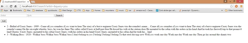 <html> <body> <form name="" action="/search"> <input type="text" name="artist" placeholder="Artist"></input> <input type="text" name="query" placeholder="lyric"></input> <button type="submit">Search</button> </form> <button onclick="window.location='/add'">Add</button> <ul> {{#songs}} <li>{{id}} - {{getSource.name}} - {{getSource.year}} {{#getHighlightFields}} - {{#lyrics.getFragments}} {{#.}}{{{.}}}{{/.}} {{/lyrics.getFragments}} {{/getHighlightFields}} </li> {{/songs}} </ul> </body> </html>要支持突出显示更高级的查询和匹配内容,可以使用 /search,如下所示: