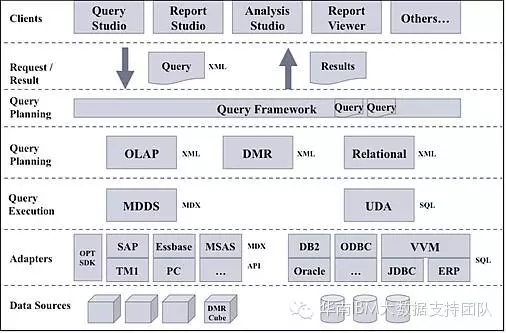 Query Planning 层的上部是 Query Framework (QFW)。QFW 会检查报表请求并确定它是否包含一个或多个请求,且应当在这里处理查询。针对 SAPBW,比如 Oracle Essbase 和 IBMCubing Services 类型的数据源的 OLAP 式查询,会转到 OLAP 查询规划器。针对 IBM DB2、Oracle、Teradata 类数据源的关系型查询会转到关系型查询规划器。Dimensionally Modeled Relational (DMR) 式的查询会转到 DMR 查询规划器。