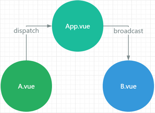 dispatch 一个事件给App dispatch 的事件,同时需要 broadcast 一个事件给B组件。 on 监听App组件分发的事件。