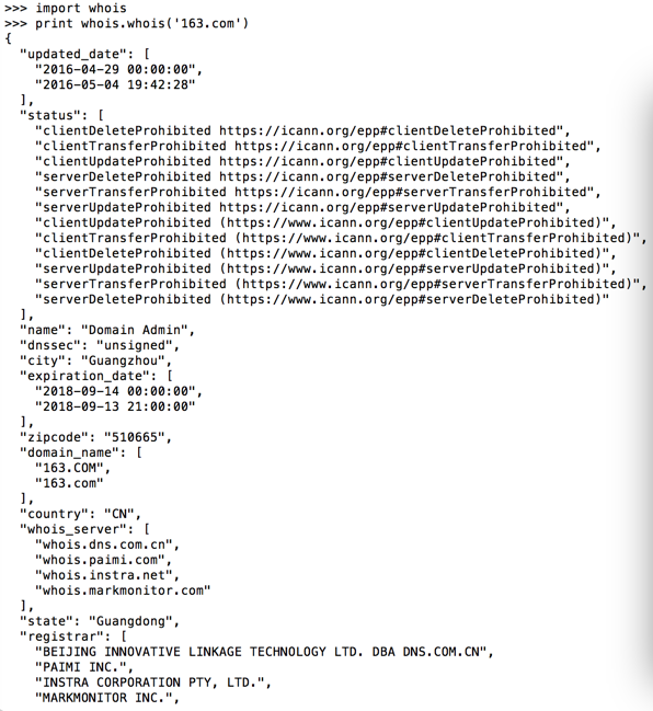 #!/usr/bin/env python # -*- encoding: utf-8 -*- import whois def MyWhois(mydomain): try: w = whois.whois(mydomain) return w except Exception,e: print Exception,e return {} ok,程序到这里基本可以实现需要的内容了,查询效果如图