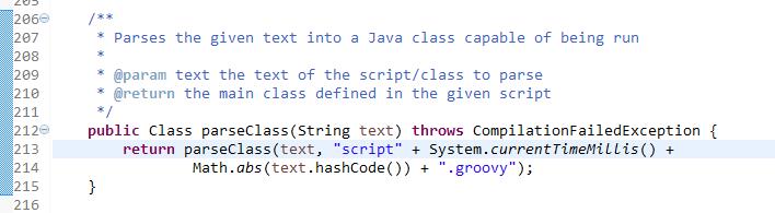 然后,我翻阅了线上启动时大量Timeout以及Full GC的项目代码。发现该项目同样适用“GroovyClassLoader”进行groovy脚本解析,断点接入如下: