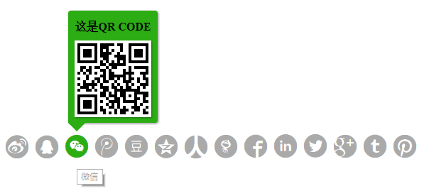 // 引入脚本文件 <script type="text/javascript" src="iShare_tidy.js"></script> // 引入HTML脚本 <div class="iShare iShare1"> <a href="#" class="iShare_qzone"><i class="iconfont qzone"></i></a> <a href="#" class="iShare_tencent"><i class="iconfont tencent" style="vertical-align: -2px;"></i></a> <a href="#" class="iShare_weibo"><i class="iconfont weibo"></i></a> <a href="#" class="iShare_wechat"><i class="iconfont wechat" style="vertical-align: -2px;"></i></a> <a href="#" class="iShare_facebook"><i class="iconfont facebook" style="vertical-align: 1px;"></i></a> <a href="#" class="iShare_googleplus"><i class="iconfont googleplus" style="vertical-align: -1px;"></i></a> <a href="#" class="iShare_linkedin"><i class="iconfont linkedin" style="vertical-align: 2px;"></i></a> <a href="#">我是酱油一号</a> <a href="#">我是酱油二号</a> </div> //子元素需要指定如下的类名: //iShare_qq : 'QQ好友', //iShare_qzone : 'QQ空间', //iShare_tencent : '腾讯微博', //iShare_weibo : '新浪微博', //iShare_wechat : '微信', //iShare_douban : '豆瓣', //iShare_renren: '人人', //iShare_youdaonote : '有道笔记', //iShare_linkedin : 'Linkedin', //iShare_facebook : 'Facebook', //iShare_twitter : 'Twitter', //iShare_googleplus : 'Google+', //iShare_pinterest: 'Pinterest', //iShare_tumblr: 'Tumblr' //插件会根据类名自动处理,如果存在不包含上述类名的子元素,该元素就不作任何处理。 // 配置全局变量iShare_config <script type="text/javascript"> iShare_config = {container:'.iShare1',config:{ title: '分享标题', description: '这是分享描述文本', url: 'https://github.com/zhansingsong', WXoptions:{ evenType: 'click', isTitleVisibility: true, title: '二维码标题', isTipVisibility: true, tip: '二维码描述文本', bgcolor: '#2BAD13', } }}; </script> // 引入样式文件(自定义样式可以不用引入) <link rel="stylesheet" type="text/css" href="./style/fonts/iconfont.css"> <link rel="stylesheet" type="text/css" href="./style/css/ishare.css"> // 引入脚本文件 <script href="javascript:;" type="text/javascript" src="iShare.js"></script> // 引入HTML脚本 <div class="iShare iShare-16 iShareClassName"></div> // 容器类名选择器: "iShareClassName" // 实例化对象 <script type="text/javascript"> (new iShare({container:'.iShare1',config:{ title: '分享标题', description: '这是分享描述文本', url: 'https://github.com/zhansingsong', isAbroad: false, isTitle: true, initialized: true, WXoptions:{ evenType: 'click', isTitleVisibility: true, title: '二维码标题', isTipVisibility: true, tip: '二维码描述文本', bgcolor: '#2BAD13', } }})); </script>