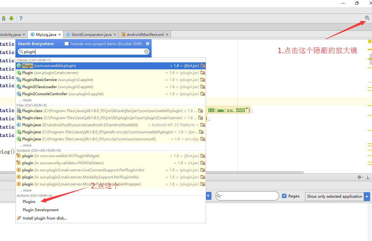 通常我们可以在AndroidStudio的右上角找到一个小小的放大镜,点击它,然后搜索plugin,就可以找到插件搜索的界面了,在这里,我们可以搜索到自己想要的插件,当然,这些插件得上传到插件库里才行,这个后面会讲到。