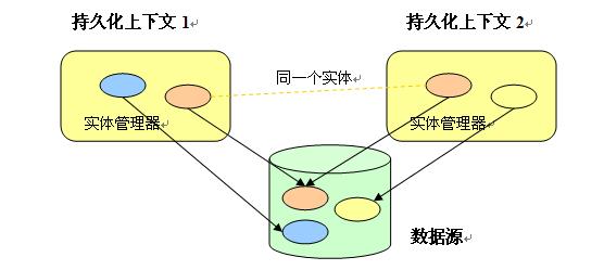 如图 1 所示,持久化上下文可以理解成一个数据库。实体管理器需要保证在持久化上下文中,每一个数据库行都只对应一个实体。但同一实体又可以被另外一个实体管理器管理。所以在一级缓存的范围内,需要借助乐观锁或悲观锁来保证实体操作的正常执行。