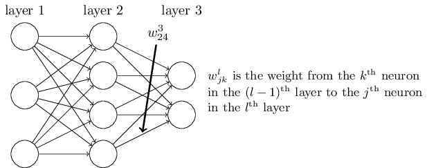 首先是明确的权重定义。使用 $w^l_{jk}$ 表示权重,代表连接 $(l-1)^{/rm th}$ 层第 $k^{/rm th}$ 个神经元 和 $l^{/rm th}$ 层第 $j^{/rm th}$ 个神经元的权重。举例来说,第二层第四个神经元和第三层第二个神经元之间的权重连接为