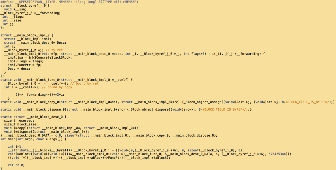 这个例子是用来研究block的原理的,在网上能搜到,本文无意解释这些代码。