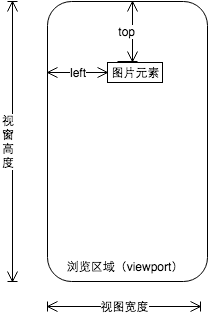 通过抓取img元素,js提供了相应的方法让我们可以获取到img元素距离视图top,和left的距离,viewport的高度和宽度等数据。然后通过监听窗口滚动事件,当页面滚动的时候,我们就去动态检测img元素的top和left值,与视窗的高度和宽度作比较,从而判断当前的img是否处于视窗范围。计算如下: