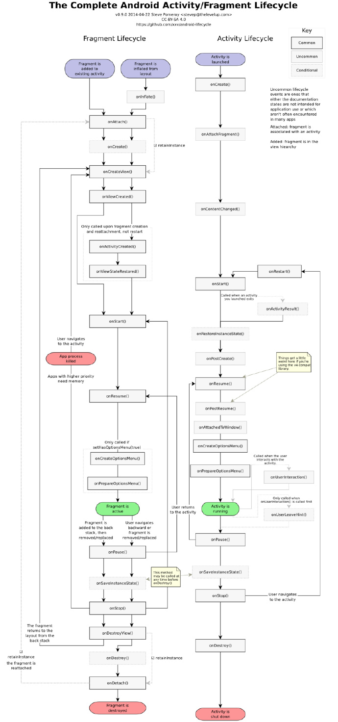 关于完整的生命周期,附上一张图,配有fragment的生命周期,可能你在很多地方都看到过,很多人盗用了它,但是并不给出处,这里提一下,它出自 android-lifecycle :