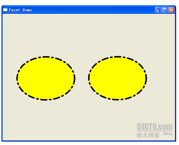 { QPainter painter(this); painter.setPen(QPen(Qt::black, 5, Qt::DashDotLine, Qt::RoundCap)); painter.setBrush(Qt::yellow); painter.drawEllipse(50, 150, 200, 150); painter.setRenderHint(QPainter::Antialiasing, true); painter.setPen(QPen(Qt::black, 5, Qt::DashDotLine, Qt::RoundCap)); painter.setBrush(Qt::yellow); painter.drawEllipse(300, 150, 200, 150); } 看看运行后的效果:
