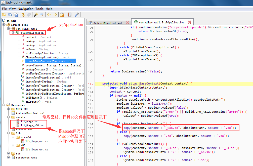 1、首先360加固依然是外部套一个Application壳:StubApplication,源程序加密存放在libjiagu.so,放在了assets目录下,在Application启动的时候,释放到应用的沙盒目录files下面,然后在使用System.load方法进行加载,这个和爱加密的方式是一样的
