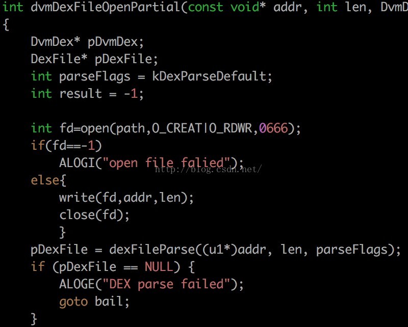 dexhunter中使用了大量的fopen/fwrite函数,将内存中的dex的文件的各部分写出来。但是梆梆对于这些函数进行了hook,根本就无法进行调用,一调用就直接退出。这种监测的绕过方法dexhunter的wiki中也有说明:If the "fwrite" and other libc functions fail, maybe these functions are hooked by hardening sevices. As a result, you cannot dump the memory via them. You can bypass this limitation by calling relevant system calls directly.就是你用别的功能类似的函数替代fopen和fwrite函数就行了。(这个地方折腾了好久,之前试过用log把内存中的数据打出来,看来用一个东西之前还是要多看wiki)。这里我使用了open和write函数。