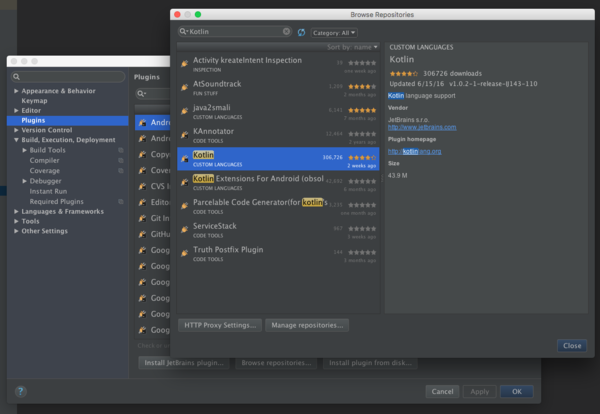 由于Kotlin是JetBrains推出的,Android Studio对其的支持度很高。在普通Android项目的基础上增加Kotlin配置只需要在插件管理中安装Kotlin插件并执行 Tools - Kotlin -Configure Kotlin in Project 即可