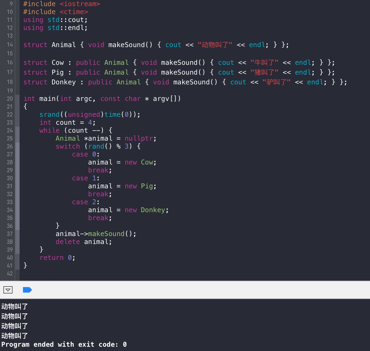 struct Pig : public Animal { void makeSound() { cout << "猪叫了" << endl; } };