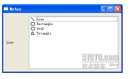 listwidget.h #ifndef LISTWIDGET_H #define LISTWIDGET_H #include <QtGui> class ListWidget : public QWidget public: ListWidget(); private: QLabel *label; QListWidget *list; }; #endif // LISTWIDGET_H listwidget.cpp #include "listwidget.h" ListWidget::ListWidget() { label = new QLabel; label->setFixedWidth(70); list = new QListWidget; list->addItem(new QListWidgetItem(QIcon(":/images/line.PNG"), tr("Line"))); list->addItem(new QListWidgetItem(QIcon(":/images/rect.PNG"), tr("Rectangle"))); list->addItem(new QListWidgetItem(QIcon(":/images/oval.PNG"), tr("Oval"))); list->addItem(new QListWidgetItem(QIcon(":/images/tri.PNG"), tr("Triangle"))); QHBoxLayout *layout = new QHBoxLayout; layout->addWidget(label); layout->addWidget(list); setLayout(layout); connect(list, SIGNAL(currentTextChanged(QString)), label, SLOT(setText(QString))); } main.cpp #include <QtGui> #include "listwidget.h" int main(int argc, char *argv[]) { QApplication a(argc, argv); ListWidget lw; lw.resize(400, 200); lw.show(); return a.exec(); } 一共三个文件,但是都比较清晰。我们先建立了一个ListWidget类,然后在main函数中将其显示出来。