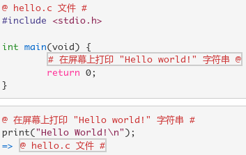@ hello.c 文件 # #include <stdio.h> int main(void) { # 在屏幕上打印 "Hello world!" 字符串 @ return 0; } zero 的 day 模式将其处理为: