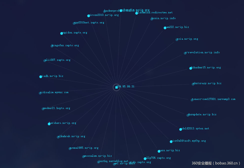 查询360威胁情报中心,上面提及的这些域名关联到同一个IP地址:204.95.99.31 。
