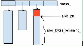 Leveldb 的简单的内存池,它所作的工作十分简单,申请内存时,将申请到的内存块放入 std::vector blocks_ 中,在 Arena 的生命周期结束后,统一释放掉所有申请到的内存,内部结构如下图所示: