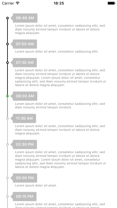 let timeline = ISTimeline(frame: frame) timeline.backgroundColor = .whiteColor() timeline.bubbleColor = .init(red: 0.95, green: 0.95, blue: 0.95, alpha: 1.0) timeline.titleColor = .blackColor() timeline.descriptionColor = .darkTextColor() timeline.pointDiameter = 7.0 timeline.lineWidth = 2.0 timeline.bubbleRadius = 0.0 self.view.addSubview(timeline) for i in 0...9 { let point = ISPoint(title: "point /(i)") point.description = "my awesome description" point.lineColor = i % 2 == 0 ? .redColor() : .greenColor() point.pointColor = point.lineColor point.touchUpInside = { (point:ISPoint) in print(point.title) } timeline.points.append(point) }