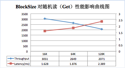 为了更好说明上述原理,笔者使用YCSB做了一个测试,分别在Get、Scan两种场景下测试不同BlockSize大小(16K,64K,128K)对性能的影响。测试结果分别如下面两图: