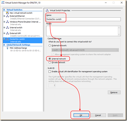 我们在这里使用局域网,来保证即使重启或者连接开发机器到一个不同网络后IP地址也保持一致。使用局域网的副作用是它没有连接到你的外部网络,所以像从公共仓库上下载Docker镜像,或者从公共源上恢复NuGet包将不起作用。为了解决这个问题,我们使用网络连接共享来共享我们的internet连接给新建的内部网络。