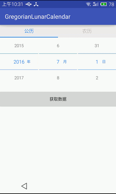此版本的 GregorianLunarCalendar 只是使用 NumberPickerView 替换 NumberPicker ,做成了一个更加优美的日期选择控件。 由于我将 NumberPicker 中常用的方法如 setValue() setMinValue() setMaxValue() setDisplayedValues() 等函数均在 NumberPickerView 中实现了,因此移植起来非常简单。 GregorianLunarCalendar 控件效果如下: