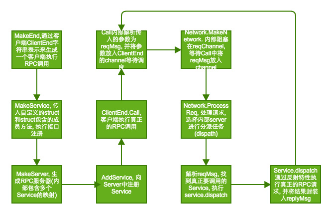 Network 用于模拟网络, 使整个RPC调用过程中在内部发生, 不需要真正的执行网路请求 Server 一个RPC Server, 内部包含多个注册的Service ClientEnd 表示RPC客户端的数据结构 Service 用于客户端来注册struct, 然后封装入该数据结构 reqSrc RPC调用的参数被解析然后重新封装到整个数据结构中 replyMsg 封装RPC调用的返回结果 架构(可以选择性忽略Network部分)