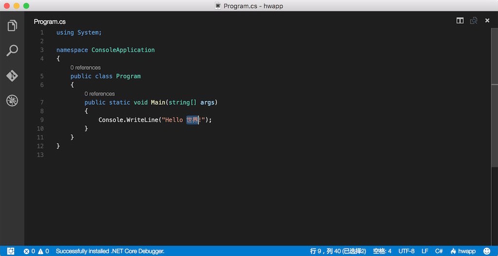 关于调试代码,可以参考 Instructions for setting up the .NET Core debugger 。如果 ⌘+O 打开的是包含 project.json 的文件夹,C#扩展便会自动生成两个文件: .vscode/tasks.json 和 .vscode/launch.json 。前者告诉VS Code如何来构建项目,后者告诉VS Code如何来运行程序。我们需要修改一下 launch.json 里, name 为 .NET Core Launch (console) 的 program ,将 <target-framework>/<project-name.dll> 替换为 netcoreapp1.0/hwapp.dll ,这样便能在VS Code的调试窗口运行程序了: