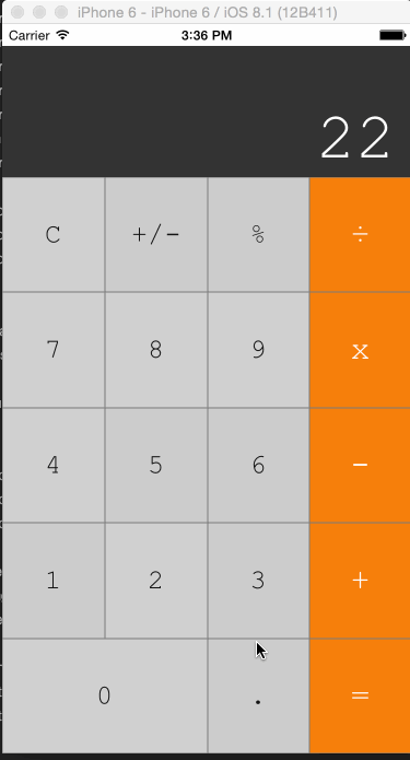 //app.component.ts import { Component, OnInit, ElementRef, ViewChild, AfterViewInit, } from "@angular/core"; import { Label } from 'ui/label'; import { Keyboard } from './Keyboard/keyboard.component'; import { device, platformNames } from 'platform'; @Component({ selector: "calculator", template: ` <GridLayout rows="auto,*" columns="*"> <!--Dispalyer--> <StackLayout row="0" style="font-size:60;color:#fff;height:120;background-color:rgba(0,0,0,0.8);text-align:right;vertical-align:bottom;"> <Label [text]="counter" #displayer></Label> </StackLayout> <!--Keyboard--> <keyboard row="1" [onKeyBoardClicked]="onKeyBoardClicked"></keyboard> </GridLayout> `, directives:[Keyboard] }) export class AppComponent implements OnInit, AfterViewInit{ public counter: string = ''; @ViewChild('displayer') displayerRef: ElementRef; private displayerView : Label; ngAfterViewInit() { this.displayerView = <Label> this.displayerRef.nativeElement; this.setIOSLabelAutoFont(this.displayerView); } private setIOSLabelAutoFont(elem: Label) { if(device.os === platformNames.ios){ elem.ios.numberOfLines = 1; elem.ios.minimumFontSize = 20; elem.ios.adjustsFontSizeToFitWidth = true; } } ngOnInit() { this.onKeyBoardClicked = this.onKeyBoardClicked.bind(this); } public onKeyBoardClicked(text:string):void { this.counter += text; } } elem.ios.numberOfLines = 1 , elem.ios.minimumFontSize = 20 , elem.ios.adjustsFontSizeToFitWidth = true 是三个 ios 的 UILabel 原生的 api 。在 NativeScript 中,我们可以使用 JavaScript 直接调用他们,NativeScript 会帮我们处理好 JavaScript 到原生的映射,包括数据类型的转换,不需要写任我的 ObjectiveC 代码。 如此,我们就实现了在文章最开始展示的交互。** 这个交互,在 ReactNative 中,是无法直接实现的! 这也是 NativeScript 相比于 ReactNative 的强大之处 。