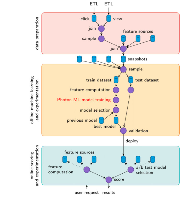 Photon机器学习是LinkedIn公司模型训练的核心,可作为其它机器学习库的热插拔替代。在上面的流程图中,圆圈代表行为,圆柱体代表数据集。