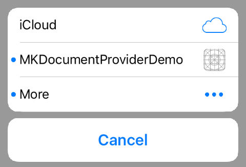 - (void)displayDocumentPickerWithURIs:(NSArray *)UTIs { UIDocumentMenuViewController *importMenu = [[UIDocumentMenuViewController alloc] initWithDocumentTypes:UTIs inMode:documentPickerMode]; importMenu.delegate = self; [self presentViewController:importMenu animated:YES completion:nil]; } UTI, Uniform Type Identifier 可以查询。