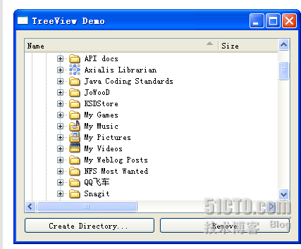 mytreeview.h #ifndef MYLISTVIEW_H #define MYLISTVIEW_H #include <QtGui> class MyTreeView : public QWidget { Q_OBJECT public: MyTreeView(); private: QDirModel *model; QTreeView *treeView; private slots: void mkdir(); void rm(); }; #endif // MYLISTVIEW_H mytreeview.cpp #include "mylistview.h" MyTreeView::MyTreeView() { model = new QDirModel; model->setReadOnly(false); model->setSorting(QDir::DirsFirst | QDir::IgnoreCase | QDir::Name); treeView = new QTreeView; treeView->setModel(model); treeView->header()->setStretchLastSection(true); treeView->header()->setSortIndicator(0, Qt::AscendingOrder); treeView->header()->setSortIndicatorShown(true); treeView->header()->setClickable(true); QModelIndex index = model->index(QDir::currentPath()); treeView->expand(index); treeView->scrollTo(index); treeView->resizeColumnToContents(0); QHBoxLayout *btnLayout = new QHBoxLayout; QPushButton *createBtn = new QPushButton(tr("Create Directory...")); QPushButton *delBtn = new QPushButton(tr("Remove")); btnLayout->addWidget(createBtn); btnLayout->addWidget(delBtn); QVBoxLayout *mainLayout = new QVBoxLayout(this); mainLayout->addWidget(treeView); mainLayout->addLayout(btnLayout); this->setLayout(mainLayout); connect(createBtn, SIGNAL(clicked()), this, SLOT(mkdir())); connect(delBtn, SIGNAL(clicked()), this, SLOT(rm())); } void MyTreeView::mkdir() { QModelIndex index = treeView->currentIndex(); if (!index.isValid()) { return; } QString dirName = QInputDialog::getText(this, tr("Create Directory"), tr("Directory name")); if (!dirName.isEmpty()) { if (!model->mkdir(index, dirName).isValid()) { QMessageBox::information(this, tr("Create Directory"), tr("Failed to create the directory")); } } } void MyTreeView::rm() { QModelIndex index = treeView->currentIndex(); if (!index.isValid()) { return; } bool ok; if (model->fileInfo(index).isDir()) { ok = model->rmdir(index); } else { ok = model->remove(index); } if (!ok) { QMessageBox::information(this, tr("Remove"), tr("Failed to remove %1").arg(model->fileName(index))); } } 构造函数中,首先我们创建了QDirModel的一个对象,并且设置ReadOnly为false,也就是说我们可以对其进行修改。而下一个setSorting()函数是对其进行排序,排序的依据也很清楚:文件夹优先(QDir::DirsFirst),忽略大小写(QDir::IgnoreCase),而且是根据名字排序(QDir::Name)。更多的规则组合可以参见 API 文档了。