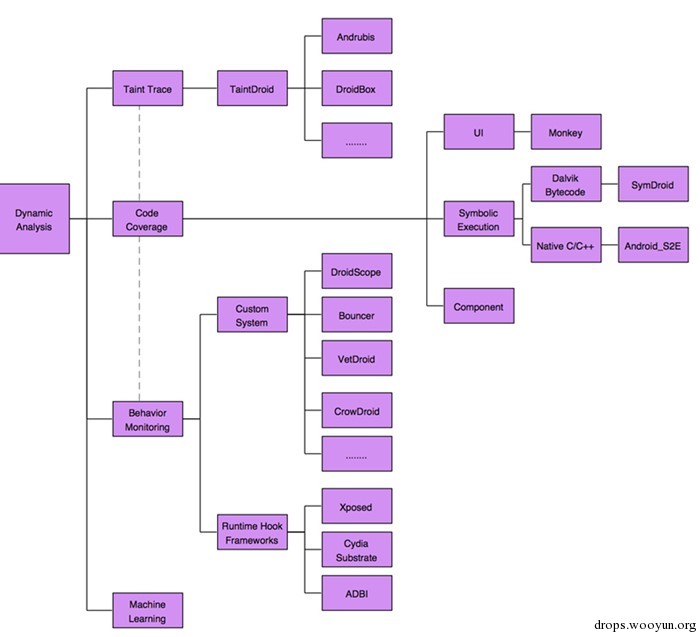 下图1-1展示了部分工业界和学术界在android平台动态分析技术上的成果,有兴趣的同学根据需求进一步了解:
