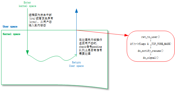 理解信号异步机制的关键是信号的响应时机,我们对一个进程发送一个信号以后,其实并没有硬中断发生,只是简单把信号挂载到目标进程的信号 pending 队列上去,信号真正得到执行的时机是进程执行完异常/中断返回到用户态的时刻。