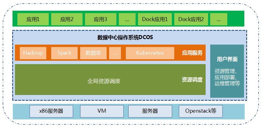 数据中心操作系统(DataCenter Operating System,简称DCOS)是为整个数据中心提供分布式调度与协调功能,实现数据中心级弹性伸缩能力的软件栈(Software Stack)。主要功能为: