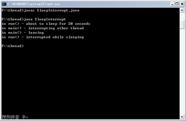 public class SleepInterrupt extends Object implements Runnable{ public void run(){ try{ System.out.println("in run() - about to sleep for 20 seconds"); Thread.sleep(20000); System.out.println("in run() - woke up"); }catch(InterruptedException e){ System.out.println("in run() - interrupted while sleeping"); //处理完中断异常后,返回到run()方法人口, //如果没有return,线程不会实际被中断,它会继续打印下面的信息 return; } System.out.println("in run() - leaving normally"); } public static void main(String[] args) { SleepInterrupt si = new SleepInterrupt(); Thread t = new Thread(si); t.start(); //主线程休眠2秒,从而确保刚才启动的线程有机会执行一段时间 try { Thread.sleep(2000); }catch(InterruptedException e){ e.printStackTrace(); } System.out.println("in main() - interrupting other thread"); //中断线程t t.interrupt(); System.out.println("in main() - leaving"); } } 运行结果如下: