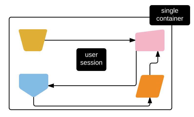 在整体型应用程序中,所有服务都被部署在同一应用服务器当中,而该应用服务器本身则提供会话管理功能。其中不同服务间的接口为本地调用,且全部服务皆可共享用户的逻辑状态。每项服务(或者组件)不需要对用户进行验证。验证工作集中由拦截器处理,其拦截所有服务调用并审查其是否可以放行。验证完成之后,其会在不同平台上的不同服务(或者组件)间发送用户登录凭证。以下示意图解释了整体应用程序中各不同组件间的交互方式。