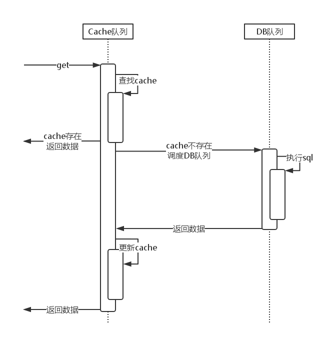 先到 cache 队列查询 cache 是否存在,存在则返回,不存在则同步到 DB 队列查询数据库,从 DB 队列返回后,回到 cache 队列先更新 cache,然后再返回。