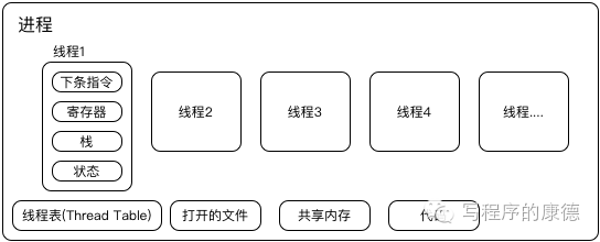 每个进程可以有多个线程。它也是一组数据结构包括:下一条要执行的指令,寄存器,堆栈,状态等。一幅图来表示