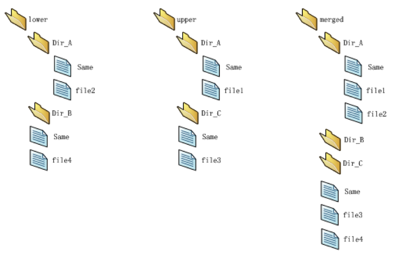 3. 目录名相同, 对目录进行合并成一个目录。如上图在 lower 及 upper 目录下都有 dir_A 目录,将目录及目录下的所有文件合并到 merged 的 dir_A 目录,目录内如有文件名相同,则同样只显示 upper 的,如上图中 dir_A 目录下的same.txt文件。