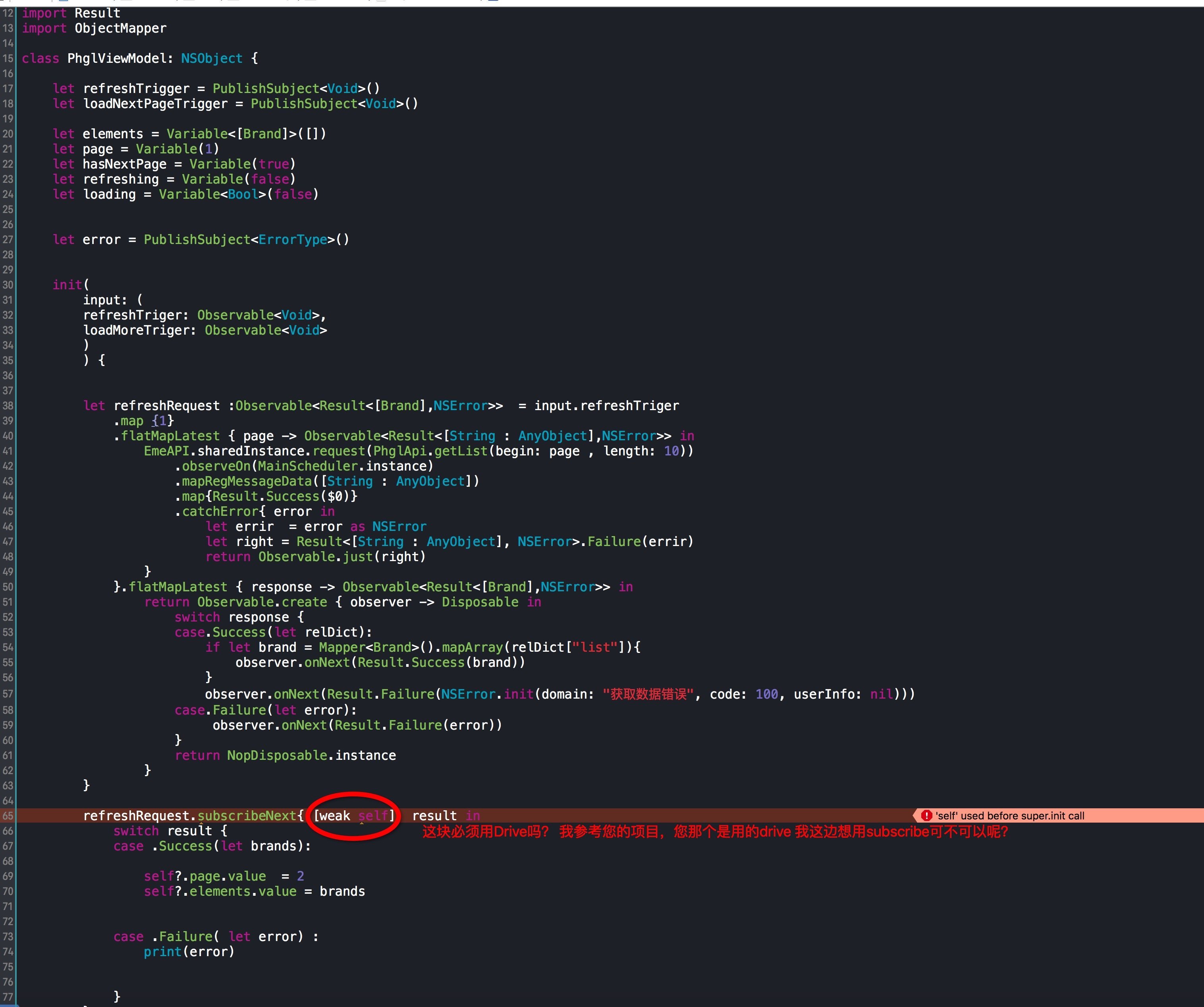 不能调用 self 是因为初始化并没有完成,可能这个问题不会被一下子发现。仔细看下代码,会发现 RhgViewModel 继承自 NSObject ,也就是说还没有调用 super.init 方法。在初始化最开始加入 super.init() 就可以了。