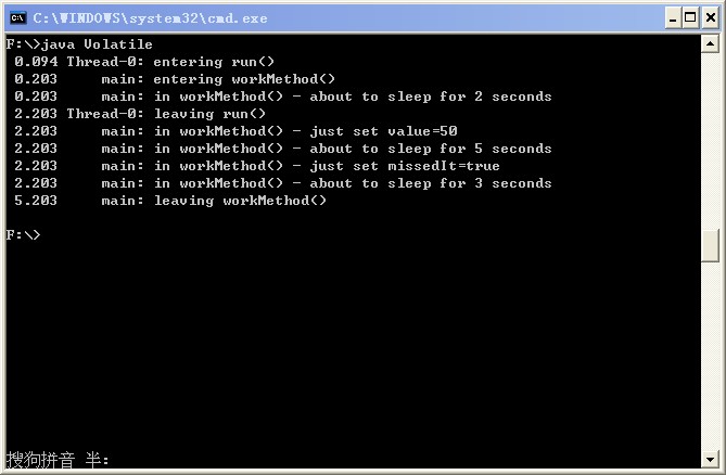 public class Volatile extends Object implements Runnable { //value变量没有被标记为volatile private int value; //missedIt变量被标记为volatile private volatile boolean missedIt; //creationTime不需要声明为volatile,因为代码执行中它没有发生变化 private long creationTime; public Volatile() { value = 10; missedIt = false; //获取当前时间,亦即调用Volatile构造函数时的时间 creationTime = System.currentTimeMillis(); } public void run() { print("entering run()"); //循环检查value的值是否不同 while ( value < 20 ) { //如果missedIt的值被修改为true,则通过break退出循环 if ( missedIt ) { //进入同步代码块前,将value的值赋给currValue int currValue = value; //在一个任意对象上执行同步语句,目的是为了让该线程在进入和离开同步代码块时, //将该线程中的所有变量的私有拷贝与共享内存中的原始值进行比较, //从而发现没有用volatile标记的变量所发生的变化 Object lock = new Object(); synchronized ( lock ) { //不做任何事 } //离开同步代码块后,将此时value的值赋给valueAfterSync int valueAfterSync = value; print("in run() - see value=" + currValue +", but rumor has it that it changed!"); print("in run() - valueAfterSync=" + valueAfterSync); break; } } print("leaving run()"); } public void workMethod() throws InterruptedException { print("entering workMethod()"); print("in workMethod() - about to sleep for 2 seconds"); Thread.sleep(2000); //仅在此改变value的值 value = 50; print("in workMethod() - just set value=" + value); print("in workMethod() - about to sleep for 5 seconds"); Thread.sleep(5000); //仅在此改变missedIt的值 missedIt = true; print("in workMethod() - just set missedIt=" + missedIt); print("in workMethod() - about to sleep for 3 seconds"); Thread.sleep(3000); print("leaving workMethod()"); } /* *该方法的功能是在要打印的msg信息前打印出程序执行到此所化去的时间,以及打印msg的代码所在的线程 */ private void print(String msg) { //使用java.text包的功能,可以简化这个方法,但是这里没有利用这一点 long interval = System.currentTimeMillis() - creationTime; String tmpStr = " " + ( interval / 1000.0 ) + "000"; int pos = tmpStr.indexOf("."); String secStr = tmpStr.substring(pos - 2, pos + 4); String nameStr = " " + Thread.currentThread().getName(); nameStr = nameStr.substring(nameStr.length() - 8, nameStr.length()); System.out.println(secStr + " " + nameStr + ": " + msg); } public static void main(String[] args) { try { //通过该构造函数可以获取实时时钟的当前时间 Volatile vol = new Volatile(); //稍停100ms,以让实时时钟稍稍超前获取时间,使print()中创建的消息打印的时间值大于0 Thread.sleep(100); Thread t = new Thread(vol); t.start(); //休眠100ms,让刚刚启动的线程有时间运行 Thread.sleep(100); //workMethod方法在main线程中运行 vol.workMethod(); } catch ( InterruptedException x ) { System.err.println("one of the sleeps was interrupted"); } } } 按照以上的理论来分析,由于value变量不是volatile的,因此它在main线程中的改变不会被Thread-0线程(在main线程中新开启的线程)马上看到,因此Thread-0线程中的while循环不会直接退出,它会继续判断missedIt的值,由于missedIt是volatile的,当main线程中改变了missedIt时,Thread-0线程会立即看到该变化,那么if语句中的代码便得到了执行的机会,由于此时Thread-0依然没有看到value值的变化,因此,currValue的值为10,继续向下执行,进入同步代码块,因为进入前后要将该线程内的变量值与共享内存中的原始值对比,进行校准,因此离开同步代码块后,Thread-0便会察觉到value的值变为了50,那么后面的valueAfterSync的值便为50,最后从break跳出循环,结束Thread-0线程。