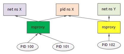 相同namespaces(所有的namespace都相同)中的所有进程共享同一个nsproxy,nsproxy包含所有具体的namespace的指针: