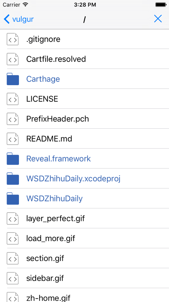 这个 controller 有一个属性 apiURLString ,是由 UINavigationController 中上一级的 controller 传入的,每个文件列表就是根据这个字符串通过 Github API 来获取文件数据的。