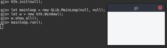 $ gjs gjs> print("Hello World!"); Hello World! gjs> const Gtk = imports.gi.Gtk; gjs> const GLib = imports.gi.GLib; gjs> Gtk.init(null); gjs> let mainloop = new GLib.MainLoop(null, null); gjs> let w = new Gtk.Window(); gjs> w.show_all(); gjs> mainloop.run(); 在你打完最后一句之后,应该会出来一个小窗口儿了。