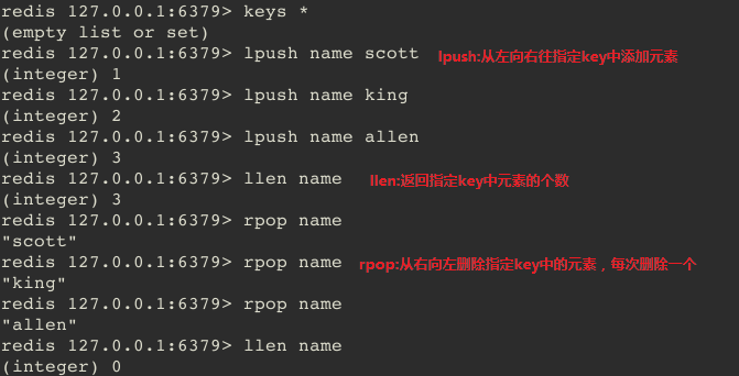 lpush key string 在key对应list的头部添加字符串元素,返回1表示成功,0表示key存在且不是list类型